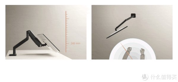 安装北弧E560支架后,显示器可以实现90上下俯仰,可以左右90旋转,实现245mm-540mm自由升降,这样可以让肩颈得到放松,又能始终保持一个健康看屏的视距。